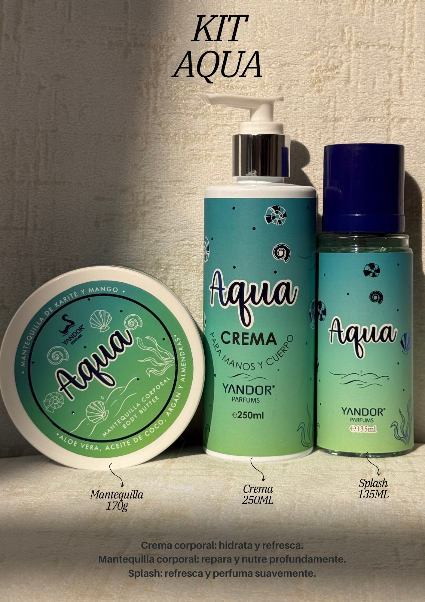 Refresca tu piel con la sensación limpia y revitalizante de Aqua. Este kit incluye crema hidratante, mantequilla corporal y splash perfumado que hidratan, suavizan y dejan una fragancia fresca y ligera ideal para el día a día. Perfecto para quienes aman los aromas suaves y refrescantes. 🌊💙