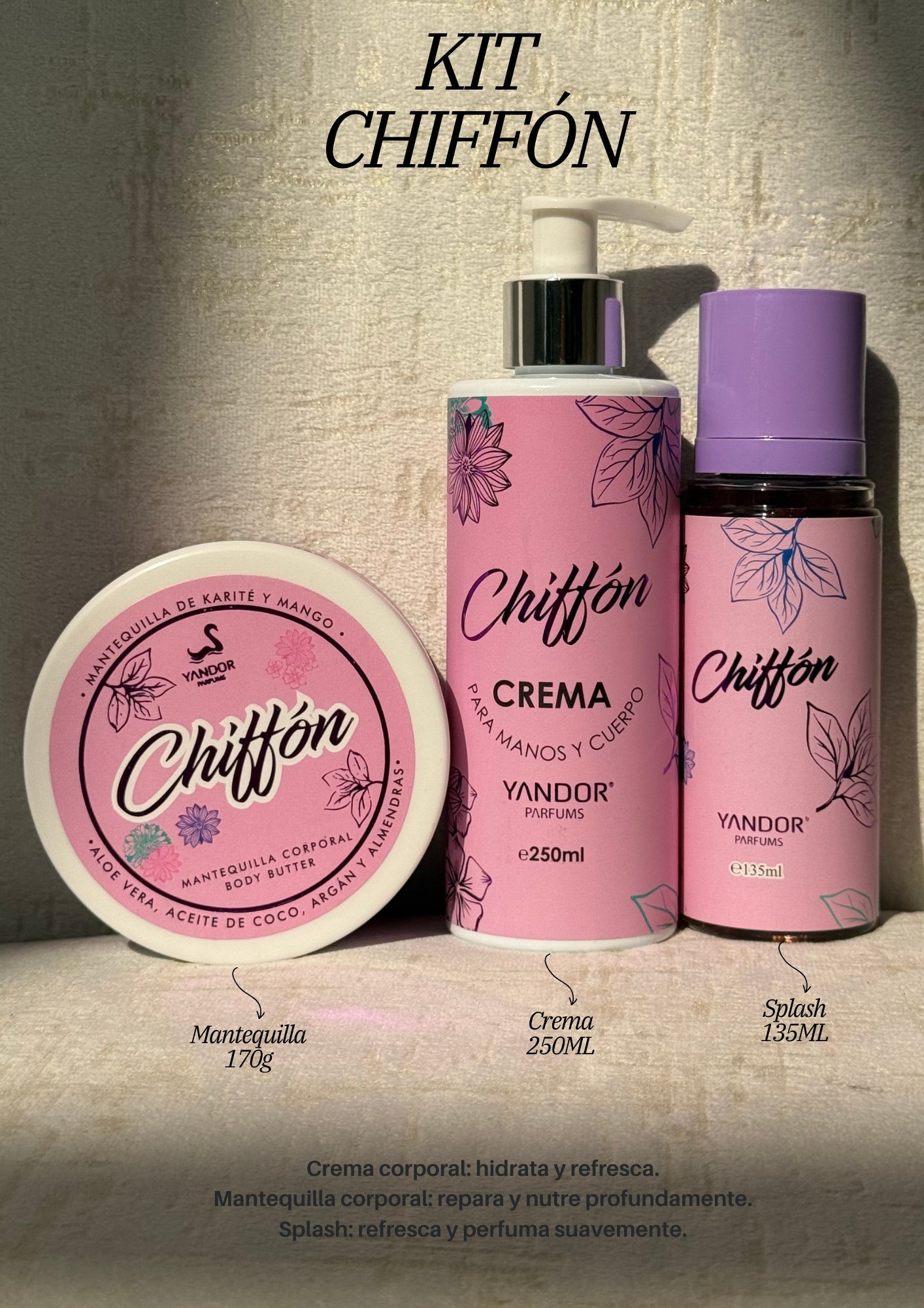 Déjate envolver por la suavidad y el aroma delicado de Chiffon. Este kit corporal incluye crema hidratante, mantequilla corporal y splash perfumado, ideales para nutrir tu piel, mantenerla suave y perfumada durante todo el día. Perfecto para consentirte o regalar.